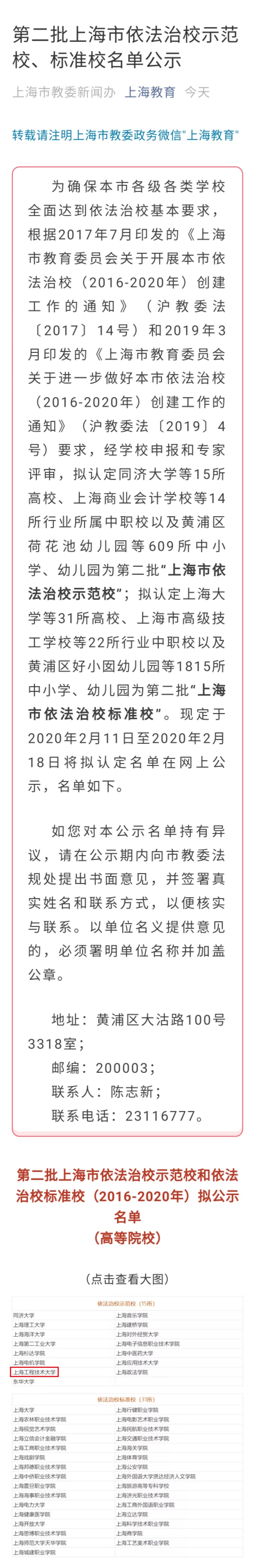 2月11日,上海市教委对第二批上海市依法治校示范校、标准校名单进行了公示,我校成功入选依法治校示范校公示名单,公示期为2月11日至2月18日。