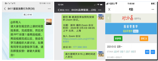 服装市场营销与管理团队主要承担“理论为主”的服装市场营销类课程,强调结合理论对客观营销现象进行分析。根据线上授课的特点和学生需求,结合教学大纲,制定每门的网上授课教学方案,重构教学设计,选择多个教学平台结合的形式加强学生线上学习效果: