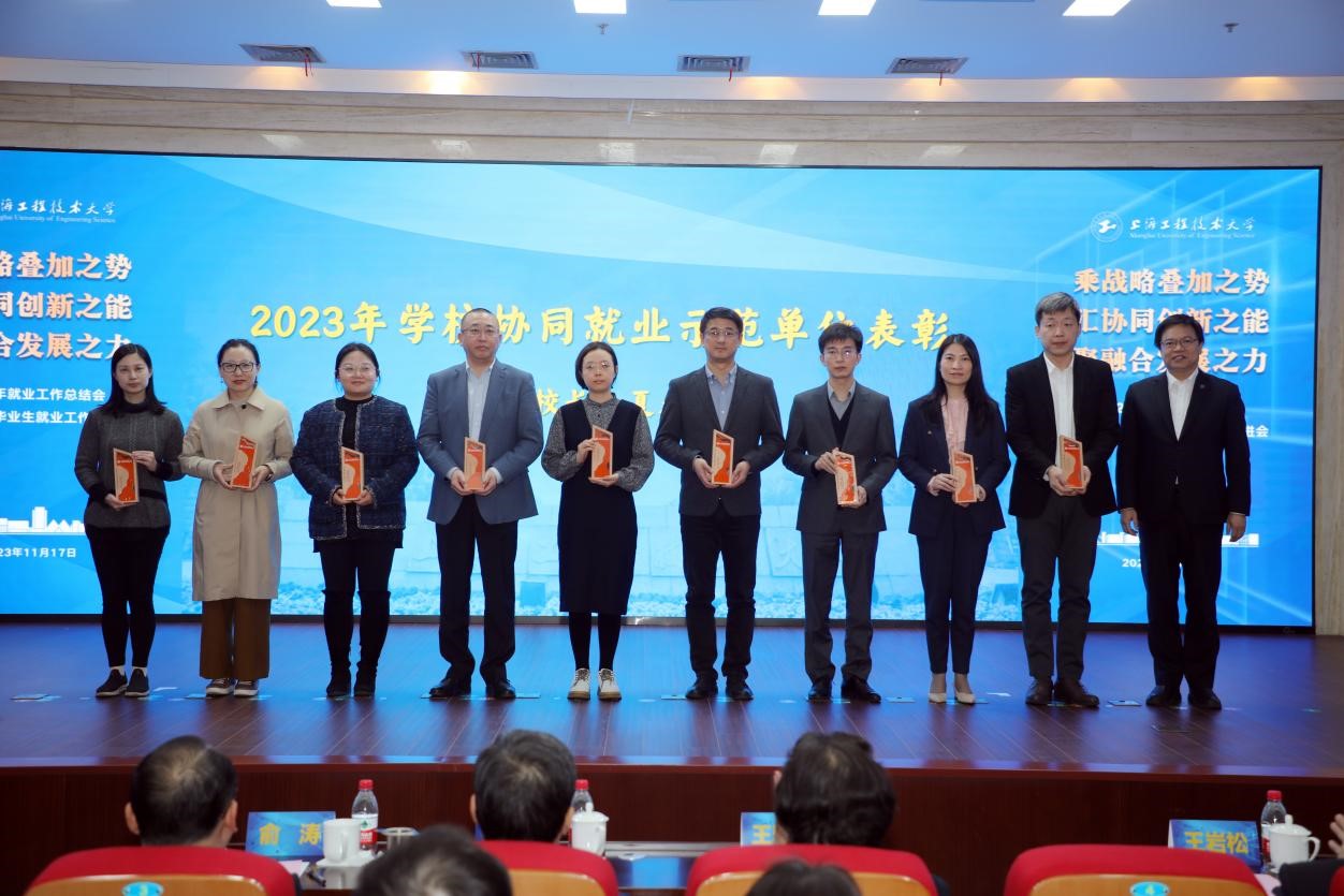 夏春明副校长为宝山钢铁股份有限公司、中国东方航空集团、上海电气集团股份有限公司等18家企业颁发了2022年学校协同就业示范单位奖。