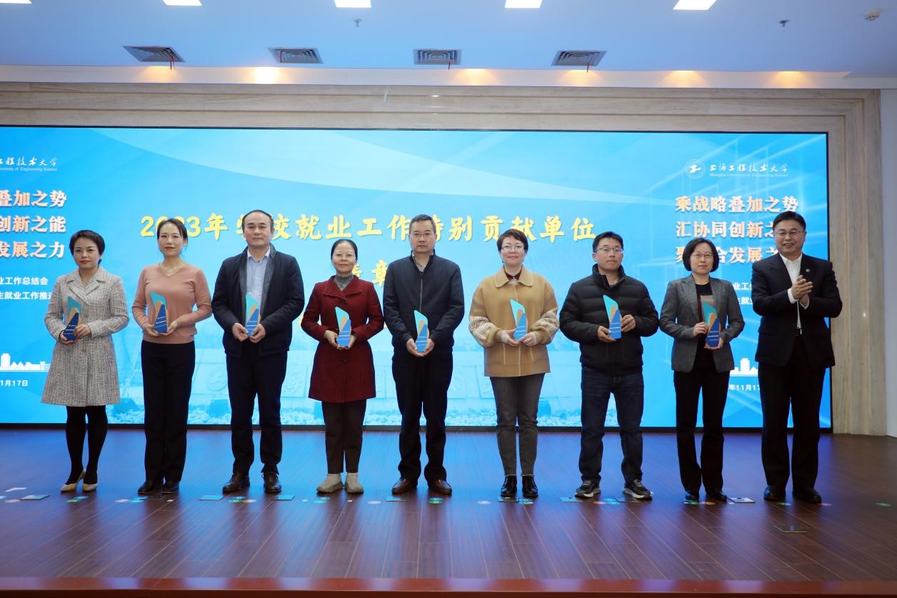 王岩松副校长为长期关心、支持学校就业工作的上海市就业促进中心、上海市工商业联合会、G60科创走廊联席办、松江区工商业联合会、松江区人力资源和社会保障局等16家单位颁发了2023年学校就业工作特别贡献奖。