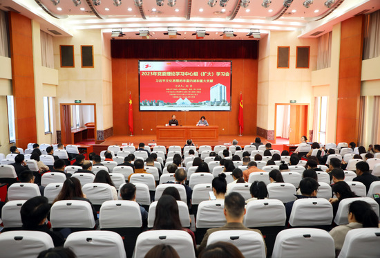 11月24日上午,学校举行党委理论学习中心组(扩大)学习会,特邀中央马克思主义理论研究与建设工程专家组主要成员、全国高校中青年马克思主义学者论坛召集人、中国国际共产主义运动史学会理事、中国列宁思想研究会常务理事、全国马克思列宁主义经济学说史学会理事、同济大学马克思主义学院副院长刘勇教授作《习近平文化思想的丰富内涵和重大贡献》专题辅导报告。校党委中心组成员、中层干部、辅导员代表参加会议,会议由校党委副书记、副校长朱晓青主持。