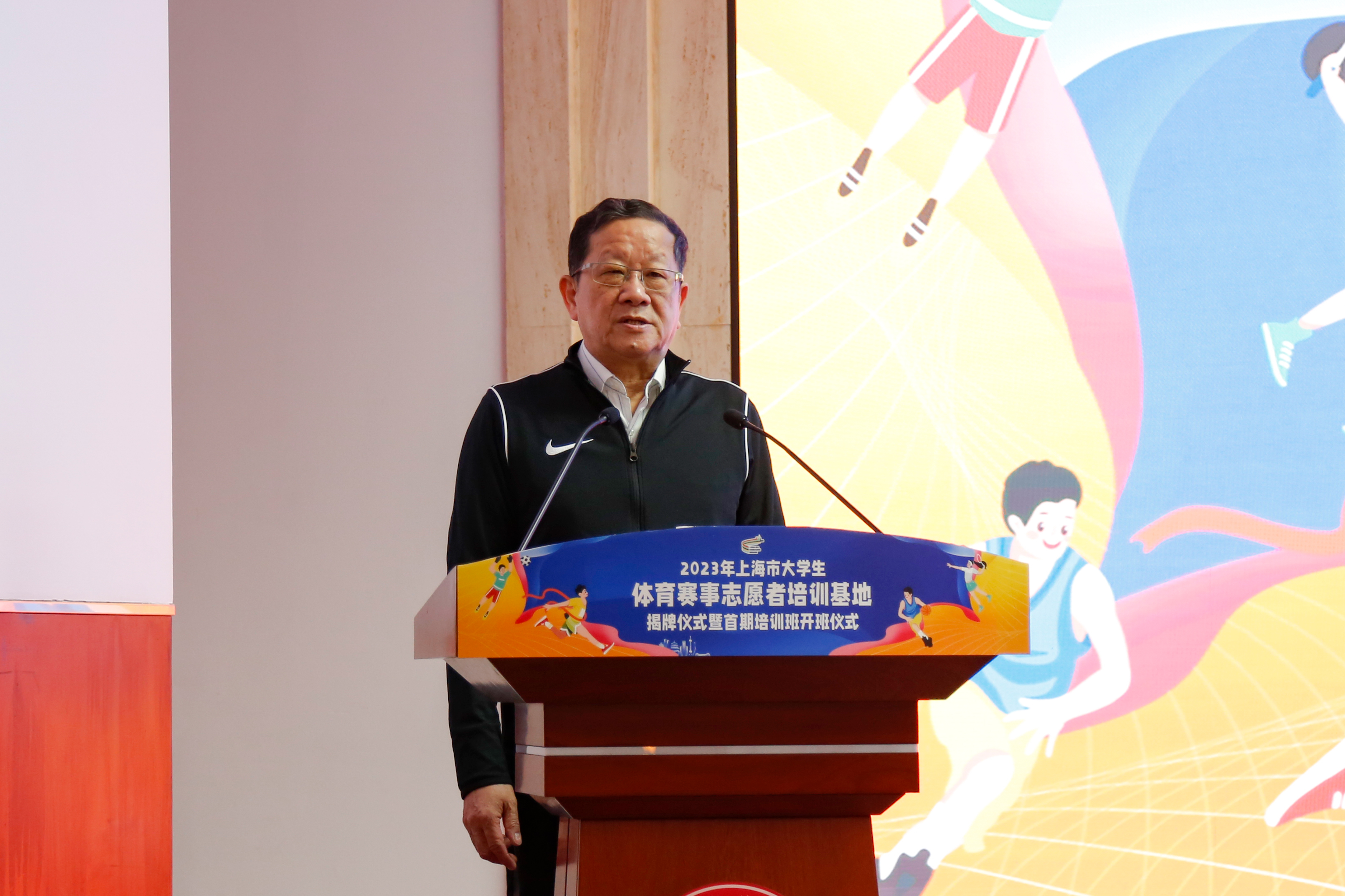 上海市大学生体育协会会长薛明扬与上海工程技术大学党委副书记、副校长朱晓青共同为基地揭牌。薛明扬会长宣布2023年上海市大学生体育赛事志愿者首期培训班开班。