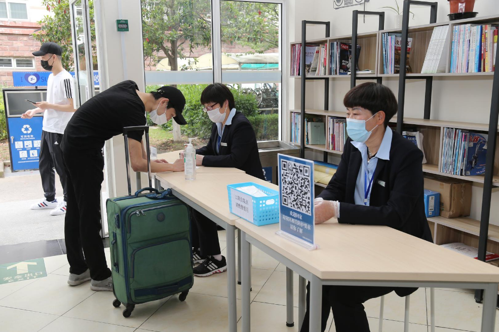 学生按照“防疫一米线”指示依次排队,由宿管人员在宿舍区开阔地对行李进行消毒;学生向宿管人员出示证件和绿码,做好体温测量和信息登记后进入寝室。入住学生出现体温异常情况,宿管人员对发热学生进行体温复测和心理疏导,联系校医生将学生带至校门诊临时留观区进行进一步处置。
