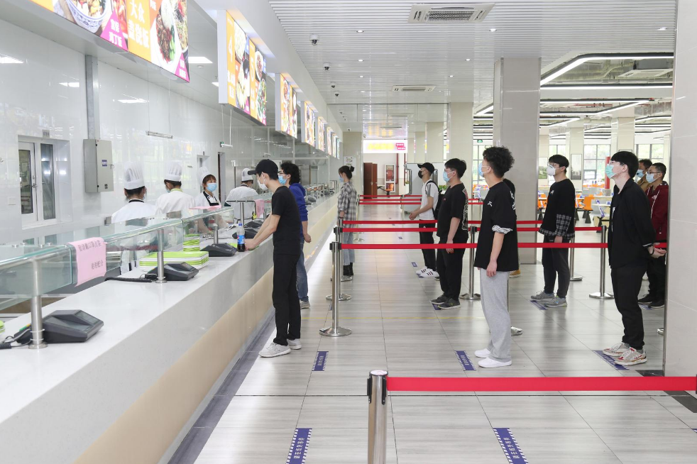 为防止就餐人员众多造成排队拥挤,学校安排学生错峰进入食堂,在食堂门口接受体温检测,并在购餐前依次进行洗手。供餐窗口地上粘贴一米线间距标识,餐桌摆放醒目一人一桌提示牌。提倡师生在疫情期间自带餐具,打包就餐;在食堂内需要分区用餐。