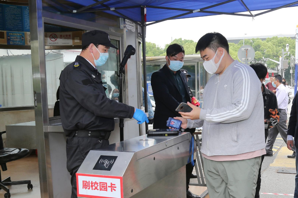 安保工作人员提醒学生佩戴口罩,按照地面上醒目的入校指引标识有序排队,依次进行绿码检查、身份核验、测温,并通过“无感红外人体热成像测温系统”进行二次测温,体温正常者可进入校园。如出现体温异常情况,立即启动应急预案,进入临时观察区进行进一步处置。