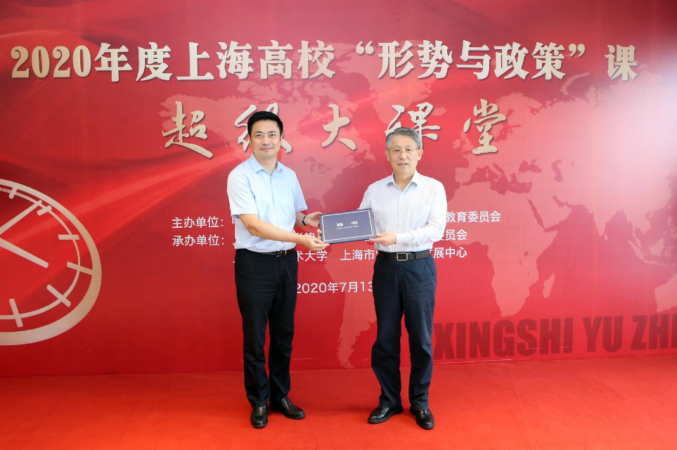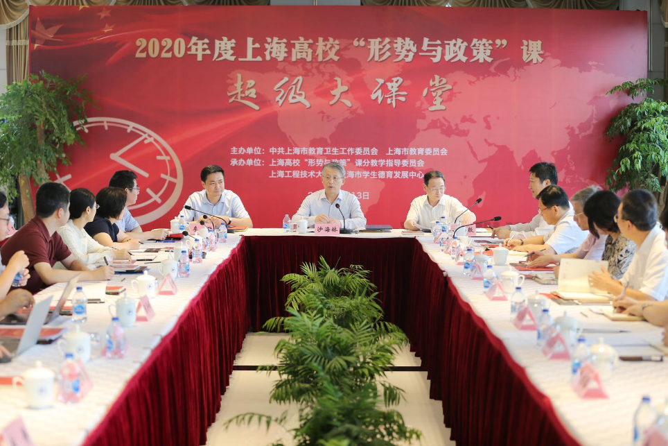 7月13日,2020年度上海高校“形势与政策”课超级大课堂首讲在我校举行。上海市人大常委会副主任、党组副书记沙海林,上海市人大侨民宗委、外事委主任委员、教育部“形势与政策”课分教指委主任委员高德毅,市教卫工作党委副书记、市教委副主任李昕,我校党委书记、上海高校“形势与政策”课分教指委主任委员李江,校党委副书记、工会主席史健勇,校党委副书记、纪委书记鲁嘉华,校党委副书记、副校长朱晓青,副校长姚秀平、王岩松、夏春明出席超级大课堂首讲活动,上海高校“形势与政策”课分教指委委员代表,我校相关职能部处、学院负责人,以及来自本市部分高校近30位“形势与政策”课负责教师参加首讲学习。本次活动由教育部“形势与政策”课分教指委主任委员高德毅主持。