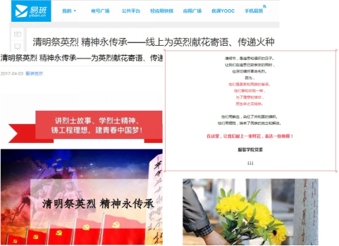 44日清明节,服装学院党委在易班、学院微信公共号、微信群、朋友圈等发起了“清明祭英烈精神永传承——为英烈献花寄语、传递火种”活动。服装学院党委组织师生党员线上为英烈献花寄语、传递火种,师生党员们纷纷留言,缅怀革命先烈的丰功伟绩,感悟当代师生的使命担当。通过组织网上祭英烈,引导师生党员缅怀先辈,牢记历史,增强爱党爱国意识,激发爱党爱国情感。“为这些革命烈士致敬!默哀!”“缅怀先烈,英雄们的精神永存!”“革命英雄,永垂不朽,精神传承,永不停歇”。留言寄语区内,师生们争相留下自己的感言体会,表达敬仰和哀思,同时提醒自己继承先烈遗志、传承红色基因、弘扬优良传统。