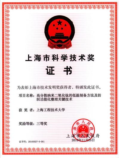服装学院王黎明教授主持完成的“高分散纳米二氧化钛的低温制备方法及纺织功能化整理关键技术”项目开发的纳米功能纺织品,经专家技术鉴定和科技查新,属于国内首创,具有新颖性和实用性,达到了国际先进水平。项目核心技术已获国家发明专利授权6项,发表高水平论文30余篇,SCIEI收录近10篇,培养硕士生8名,并获得了上海市优秀发明选拔赛金奖2项,2012年香港桑麻纺织科技奖1项等。项目成果已在多家企业中进行了一定的推广应用,开发了高性能纳米光触媒复合多功能系列的窗帘、家用床上用品及轿车成型地毯、车用脚垫等。
