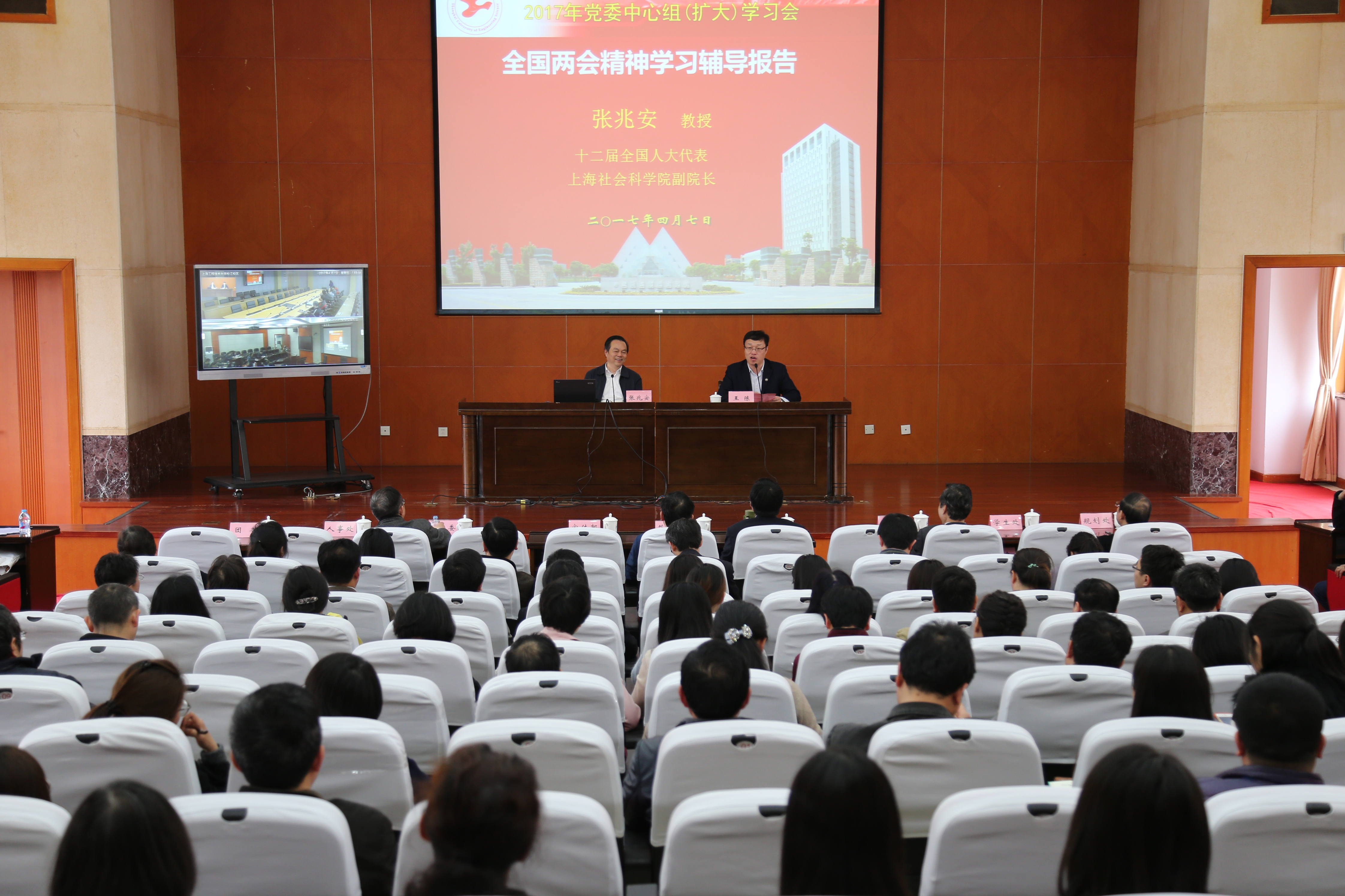 4月7日,学校召开党委中心组扩大学习会,十二届全国人大代表、上海社会科学院副院长张兆安研究员应邀作了题为“两会精神学习”专题辅导报告。来我校挂职的云南工业技师学院党委书记范永春,中心组成员、中层干部、支部书记、学生辅导员共计200余人参加了会议。党委宣传部部长兼党办主任王陈主持会议。