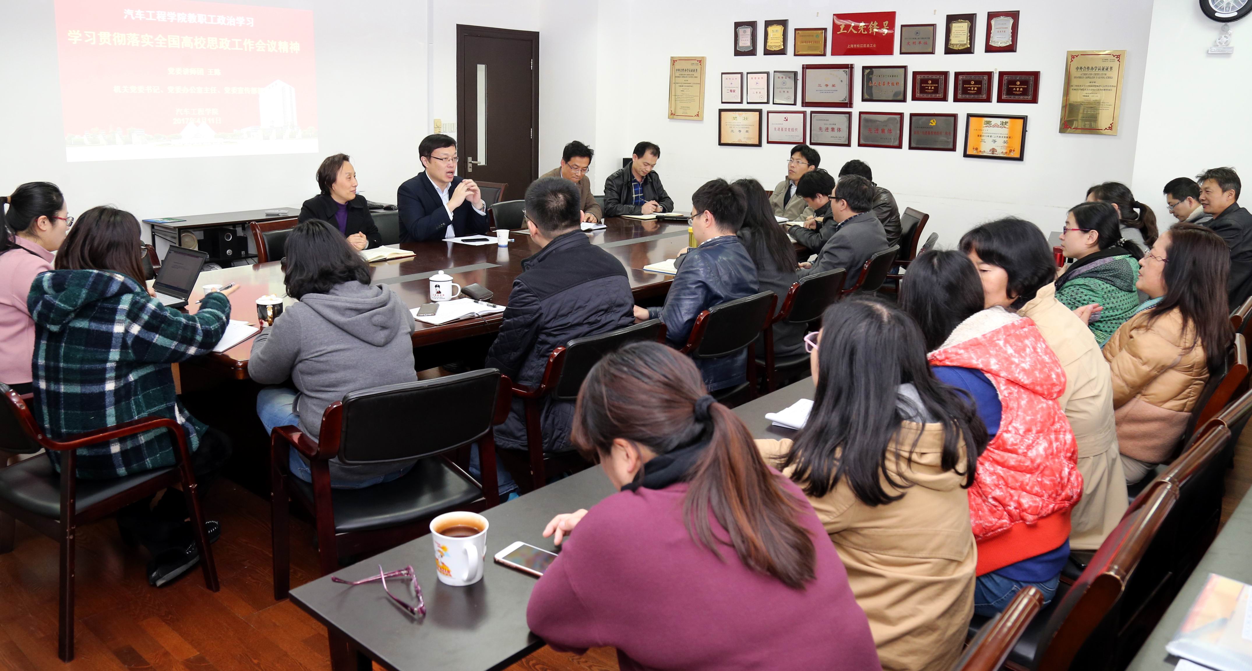 “高校思政教育不仅是思政教师的责任,更是每一位老师职责所在。”为了实现对二级学院进行全国、上海高校思想政治工作会议精神宣讲全覆盖,学校党委组建了党委讲师团传达精神。4月11日,校党委讲师团成员、党委宣传部部长兼党办主任王陈,赴汽车工作学院开启了讲师团巡讲第一课。