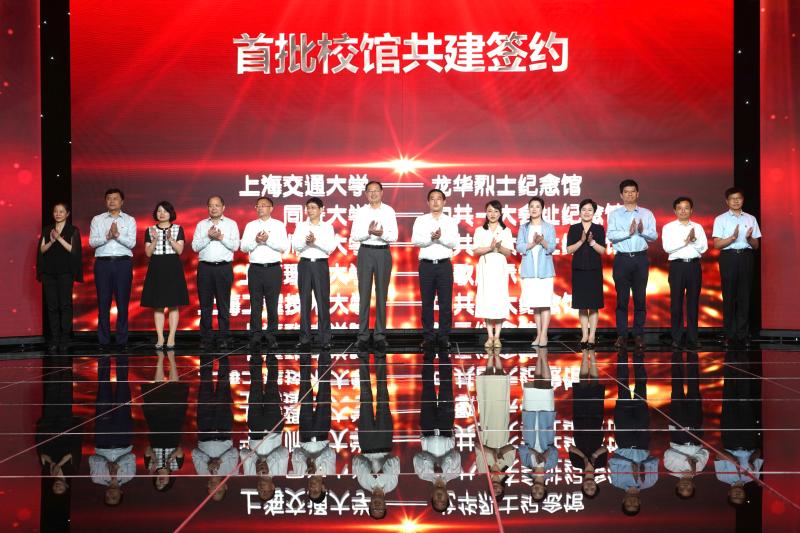 为更好地学习宣传贯彻习近平总书记给复旦大学《共产党宣言》展示馆党员志愿服务队全体队员回信精神,落实市委关于开展党史、新中国史、改革开放史、社会主义发展史学习教育的部署,引导大学生更加生动学习把握习近平新时代中国特色社会主义思想,让师生在学思践悟中坚定理想信念,在奋发有为中践行初心使命,努力为实现“两个一百年”奋斗目标、实现中华民族伟大复兴的中国梦贡献智慧和力量,7月17日,由上海市委宣传部指导,上海市文明办、上海市教卫工作党委、上海市教委共同主办,上海市志愿者协会、上海教育电视台协办的“学思践悟强信念 奋发有为报国行”——上海市学生红色文化传播志愿服务队成立暨上海学校红色文化传播育人联盟成立仪式在上海教育电视台举行。市委宣传部副部长、市文明办主任、市志愿者协会会长潘敏,市教卫工作党委副书记、市教委副主任、市志愿者协会副会长李昕等出席,校党委副书记、副校长朱晓青代表我校与中共四大纪念馆进行了首批校馆共建签约。