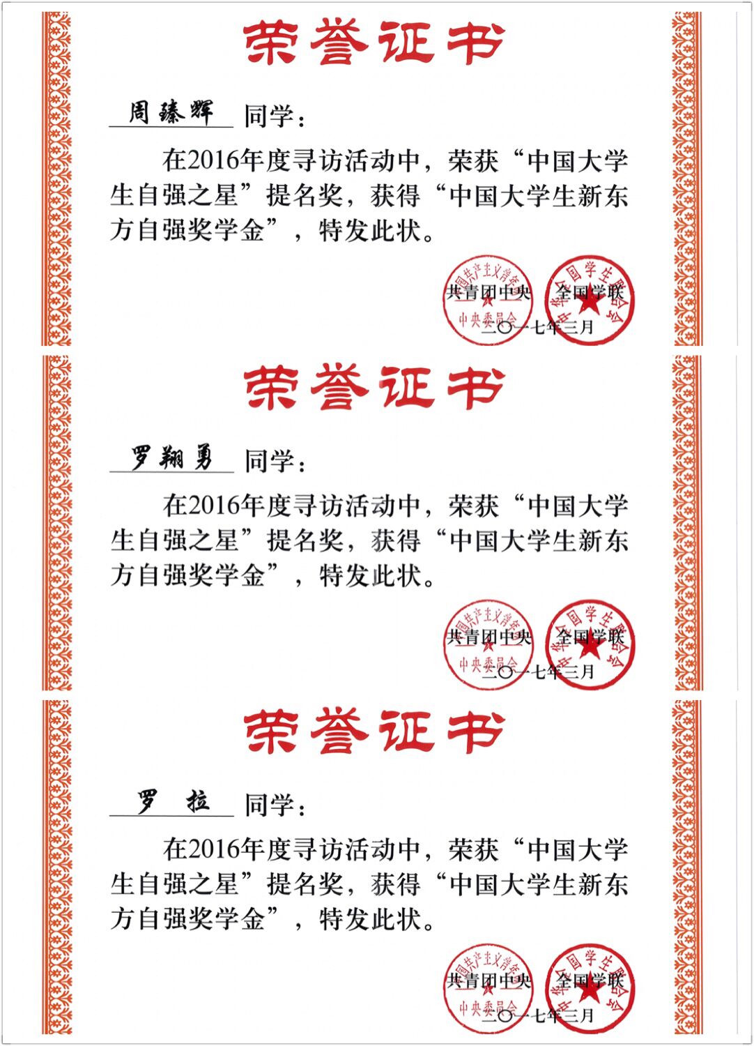 近日,由共青团中央、全国学联主办的“中国大学生自强之星”寻访活动结果揭晓,我校电子电气工程学院周臻辉同学、城市轨道交通学院罗翔勇同学和社会科学学院罗拉同学荣获“中国大学生自强之星”提名奖。